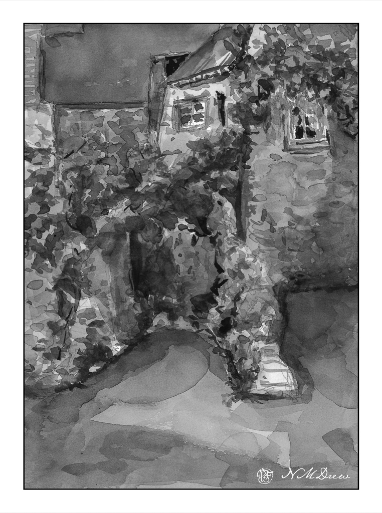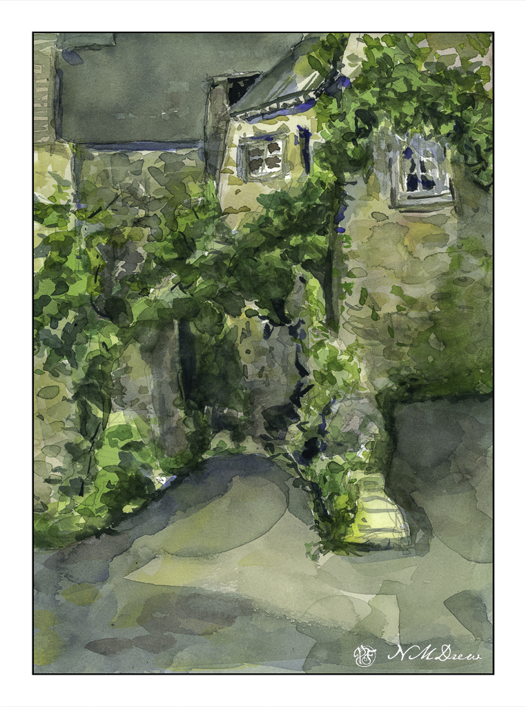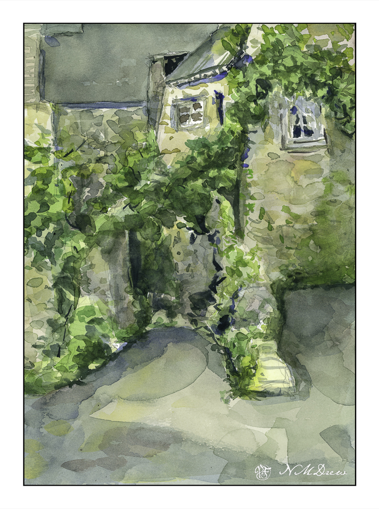 As I looked at the reference photo, I noticed a window I had not seen in the tunnel below the arching greenery, as well as shapes and areas of light and dark. Was there space without greenery beyond that arch? Was there a turn to the left at the end of the tunnel? How did all these buildings all interconnect? The fact is – I don’t know! So, artistic license as you will, reality is also important as I would like to figure out what I am dealing with, especially when painting the challenging and unfamiliar – old, stone buildings.