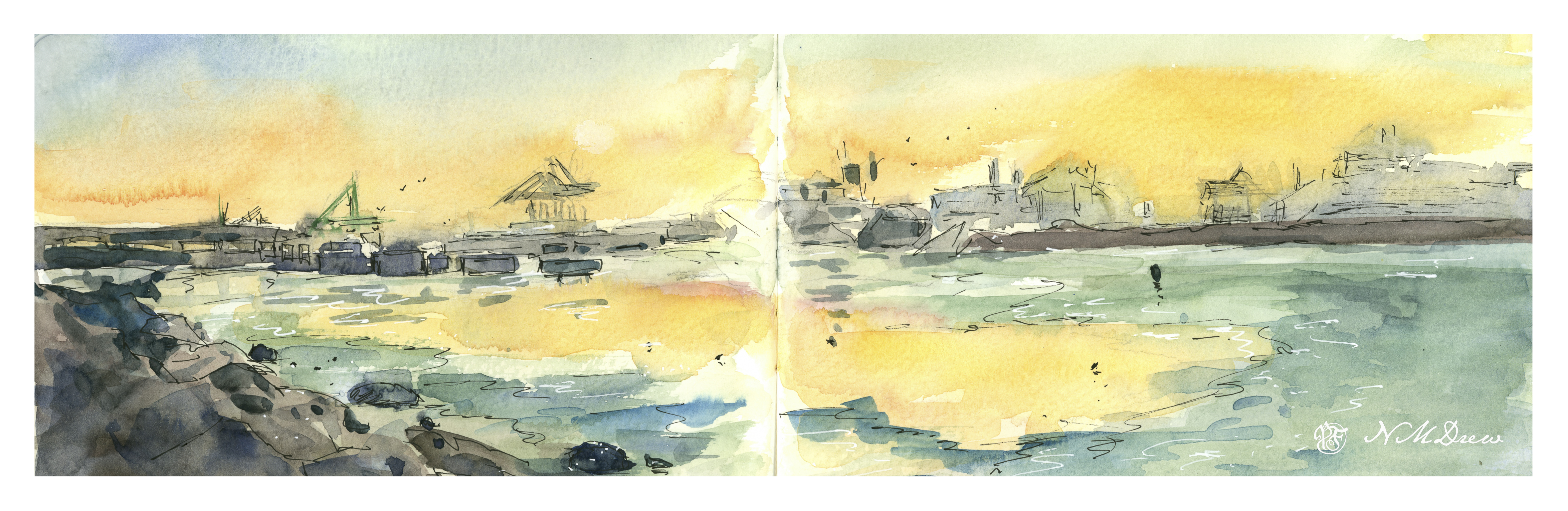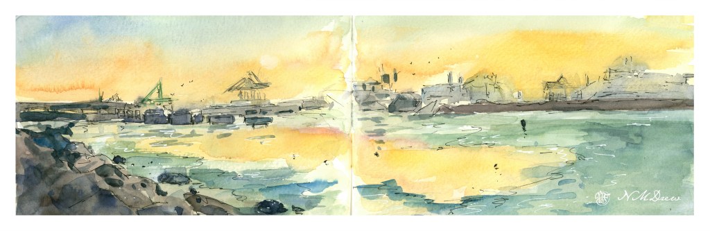 Colors were fun to use, too. I mixed together an especially interesting mix of Payne’s Grey, Carbazole Violet, and Burnt Sienna. That is part of the pleasure of a sketch book – playtime and exploring.