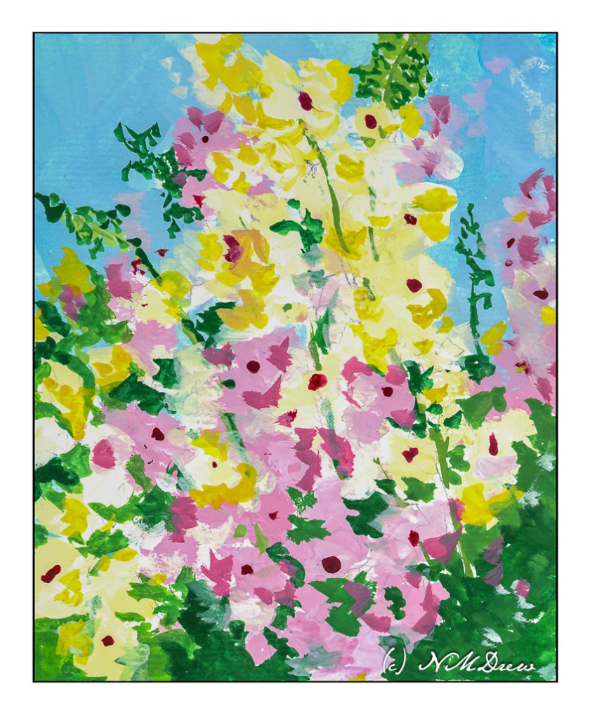 My own painting is more blue than Monet’s, but I saw a lot of blue in my reaction to his painting. Comparing the two is really interesting when I compare my scan to the Wikimedia online image presented here. It is hard work to get a good, warm grey and I did struggle with it. I also had to work on observing little things, such as the boats on the left middle edge – I couldn’t figure them out initially. The chimneys on the horizon also needed to be considered – what were they? The smoke on the left horizon gave it away. Once I had the boats on the left sorted, the vertical lines reflected in the water made a lot of sense.