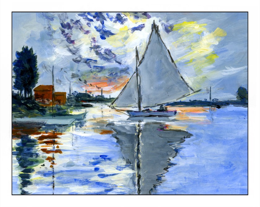 The original painting by Claude Monet was painted in 1874 and measures approximately 22 x 29 inches. My painting measures 11 x 14 inches, so it is close to the same proportions. I left out a few things simply because I was not trying to replicate Monet’s painting but catch its sense of spontaneity. This spirit is what I found refreshing, and while Monet probably finished this painting alla prima, I spent about 6 hours in the studio. He used oils. I used fluid acrylics.