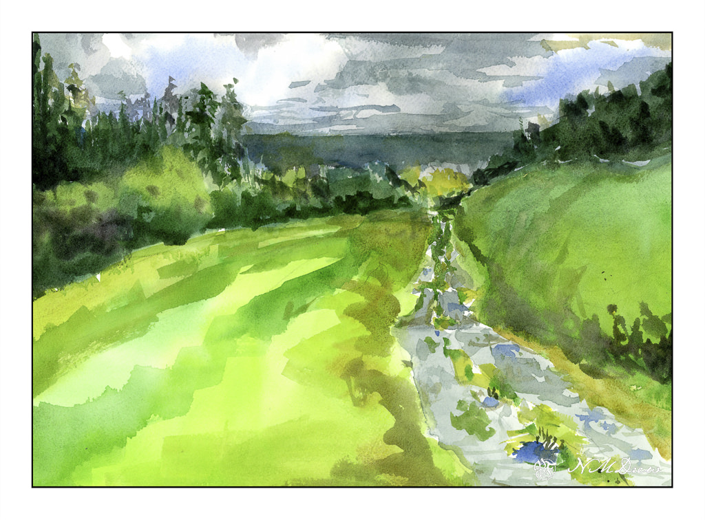 The original painting by Claude Monet was painted in 1874 and measures approximately 22 x 29 inches. My painting measures 11 x 14 inches, so it is close to the same proportions. I left out a few things simply because I was not trying to replicate Monet’s painting but catch its sense of spontaneity. This spirit is what I found refreshing, and while Monet probably finished this painting alla prima, I spent about 6 hours in the studio. He used oils. I used fluid acrylics.