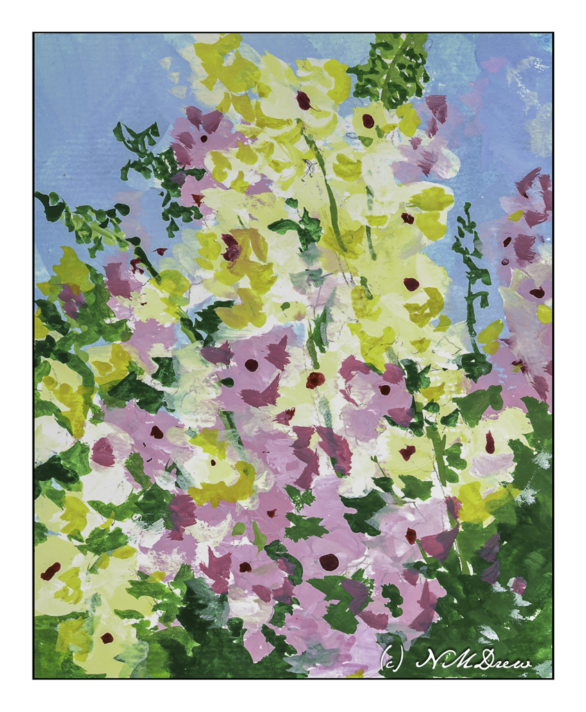 My own painting is more blue than Monet’s, but I saw a lot of blue in my reaction to his painting. Comparing the two is really interesting when I compare my scan to the Wikimedia online image presented here. It is hard work to get a good, warm grey and I did struggle with it. I also had to work on observing little things, such as the boats on the left middle edge – I couldn’t figure them out initially. The chimneys on the horizon also needed to be considered – what were they? The smoke on the left horizon gave it away. Once I had the boats on the left sorted, the vertical lines reflected in the water made a lot of sense.