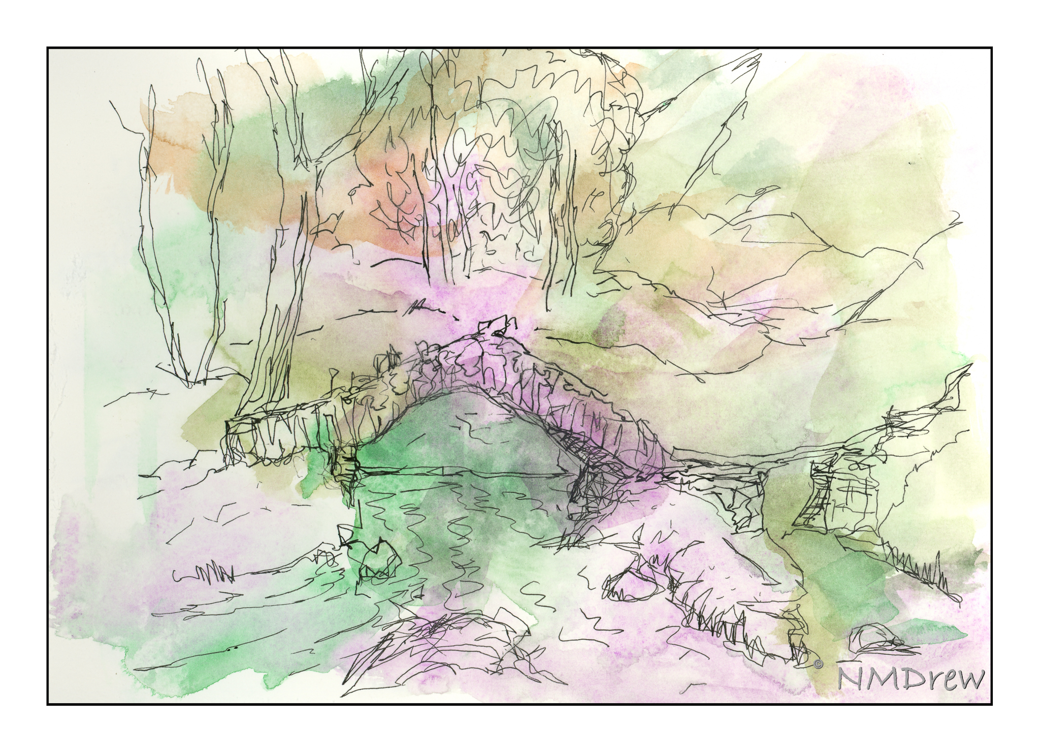 I have been rather lazy today, too lazy to set up to paint. So, an old exercise came to mind: make a messy color mix on paper and draw over it with ink. I had Slater’s Bridge already chosen as the subject matter for this exercise (partly for Ms. Fragglerocking, partly because I think it’s such a lovely bit of stonework). As a result, I plopped on colors and then drew the bridge from different angles.