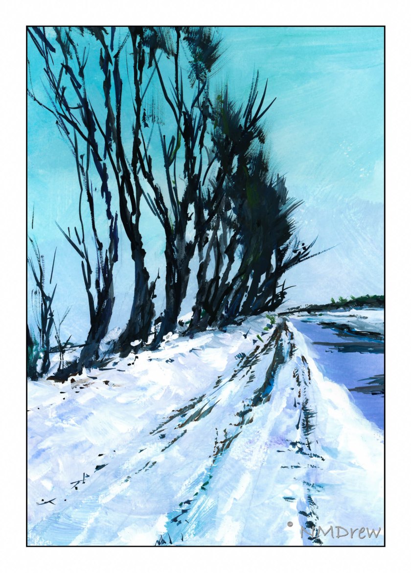 This time I laid in the background color, such as the blue of the sky merging into the gold of the horizon, blending them together with white. the same with the diagonal hedgerow and foreground snow. After that, I used a tiny, tiny brush, soft to the touch, and filled it with gouache paint I thinned down a lot.