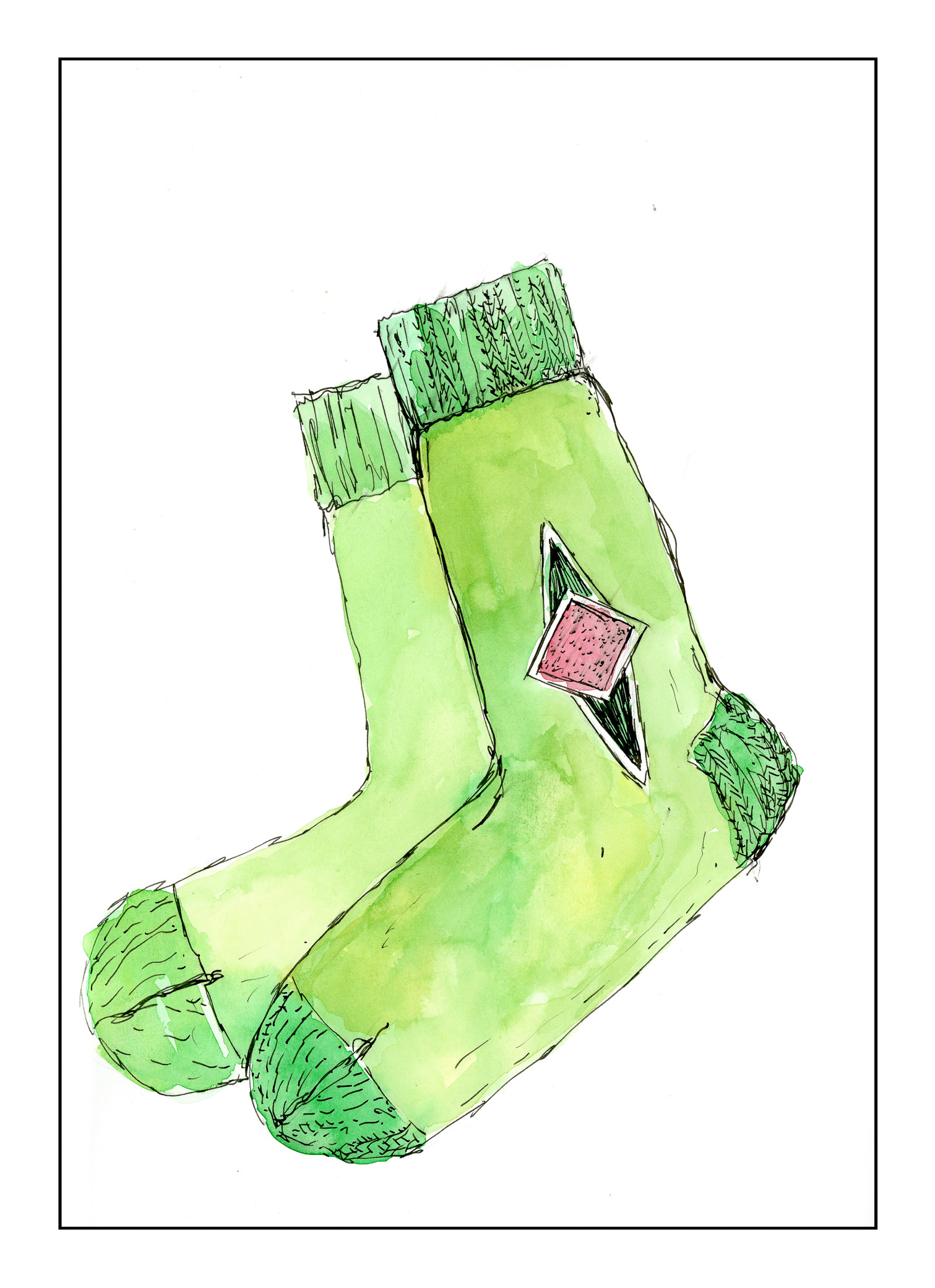 Here, you can see the difference between the two socks, especially at the heel. The short-row heel sock is a bit too short, and the Fleegle heel sock is a bit too long. Still, I have no plans of ripping out either sock, and will wear them as a pair!