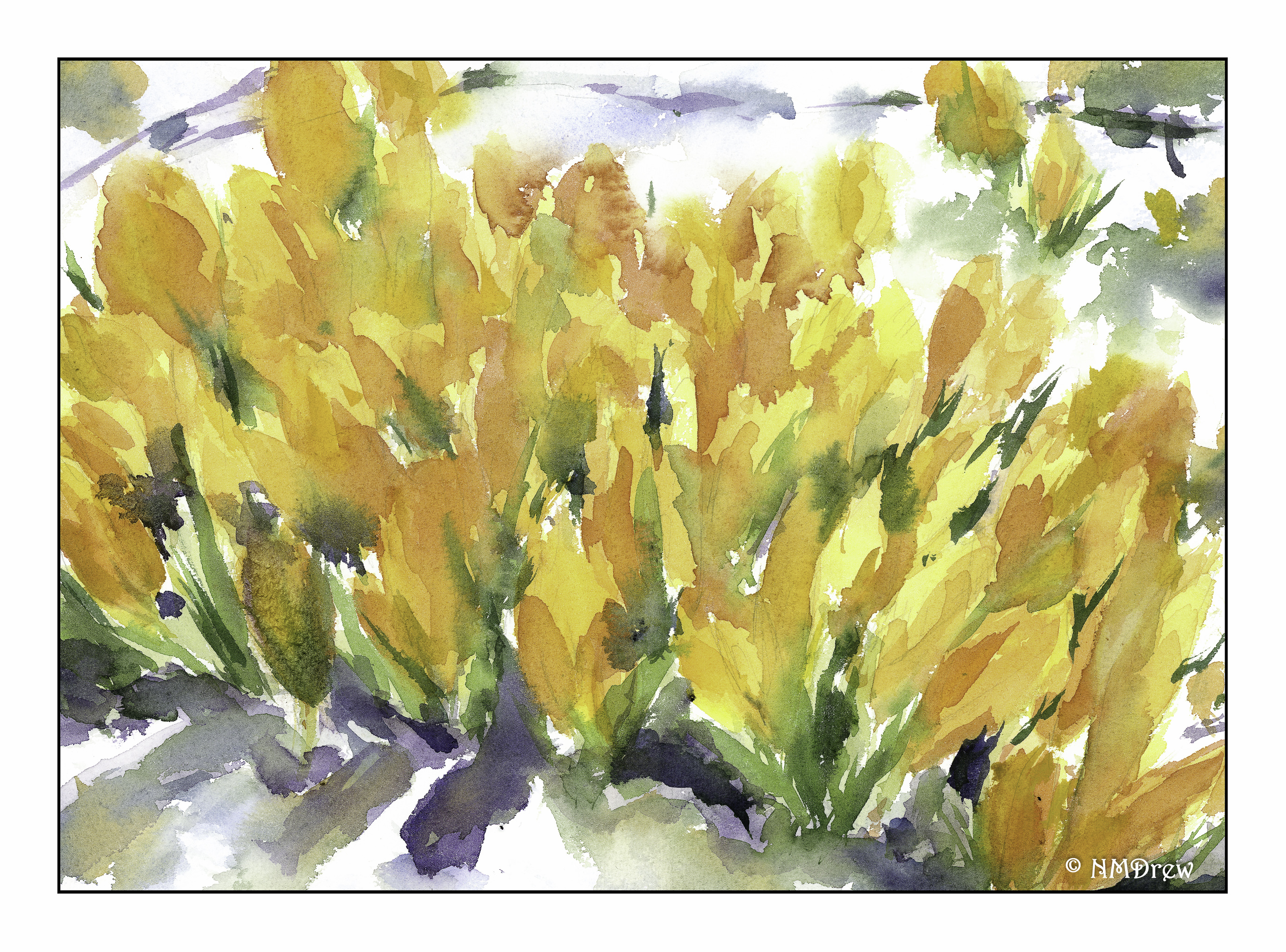 This became more of an impression of crocus rather than a detailed study. To tell the truth, I have never seen a crocus in my life! I can imagine the joy they bring, though, as they peek through the last of the winter’s snow. Hyacinths were the bulbs that bloomed in the snow in the midwest, soon followed by tulips and daffodils. I tried to work with negative space to define the flowers, as well as blur the background and put a bit more detail in the foreground – perspective in action on a conscious level!