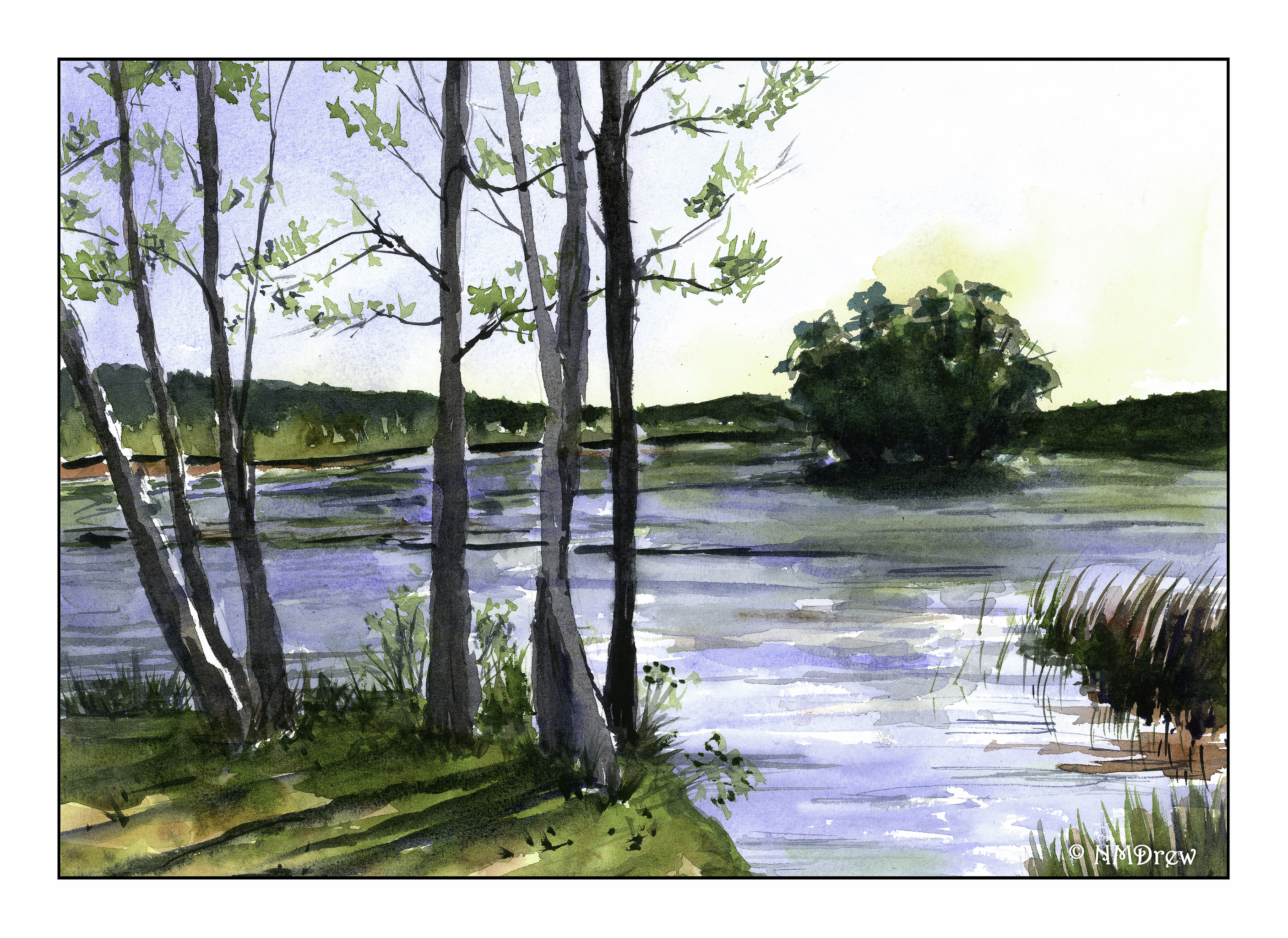 Such memories are the inspiration for this watercolor. I wanted to show the crowded growth along the banks, the greenish water, et cetera, et cetera. I also wanted to make it a simpler painting, trying to do masses of color without all these details. I don’t know if that would have been possible but I think I will try this painting again, but I need to think about it and play a bit to get it. As well, the whitish bark of the trees, living and dead, were hard to paint – decisions to paint around, then tint, or tint and then paint around them drove me a bit to the frantic side of my personality, which already tends towards hysteria.