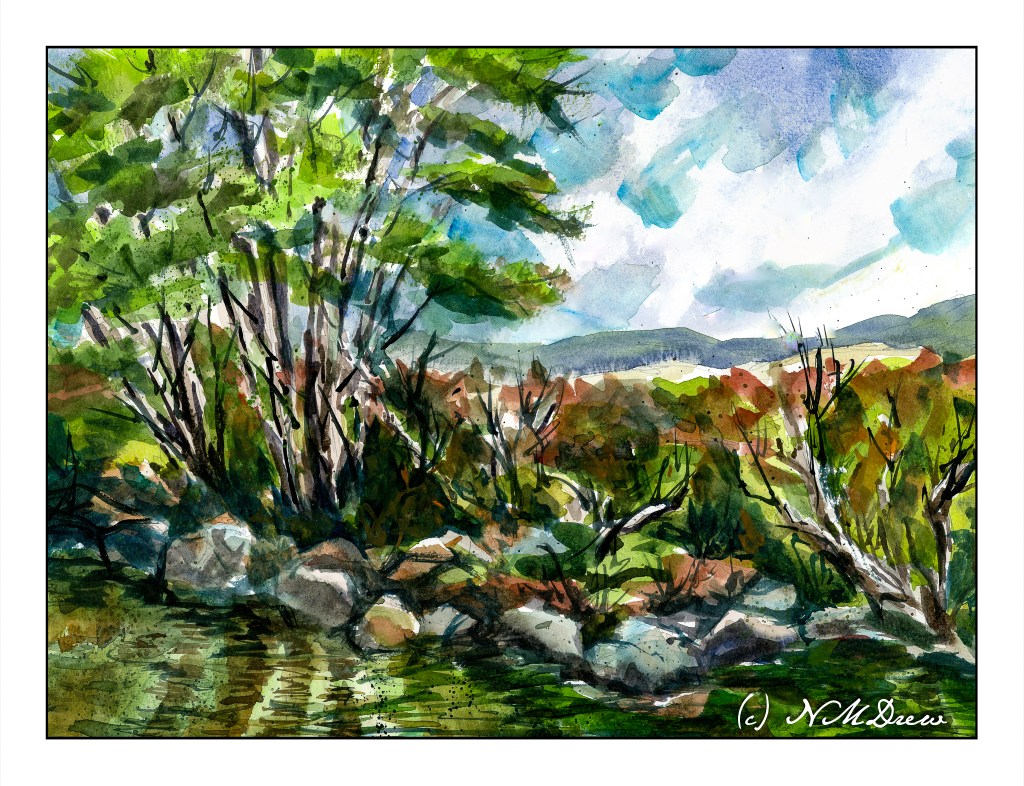 I also used a new-to-me watercolor paper, made by St. Cuthbert’s Mill in England. I am not sure as to its fiber content, but it is archival. The texture is nice, size is good at 11×15 inches, and worked really well with the paints and water. Color could be lifted, as in the reflections of the trees on the left in the creek. So far I am pleased with this paper and definitely plan more paintings using it.