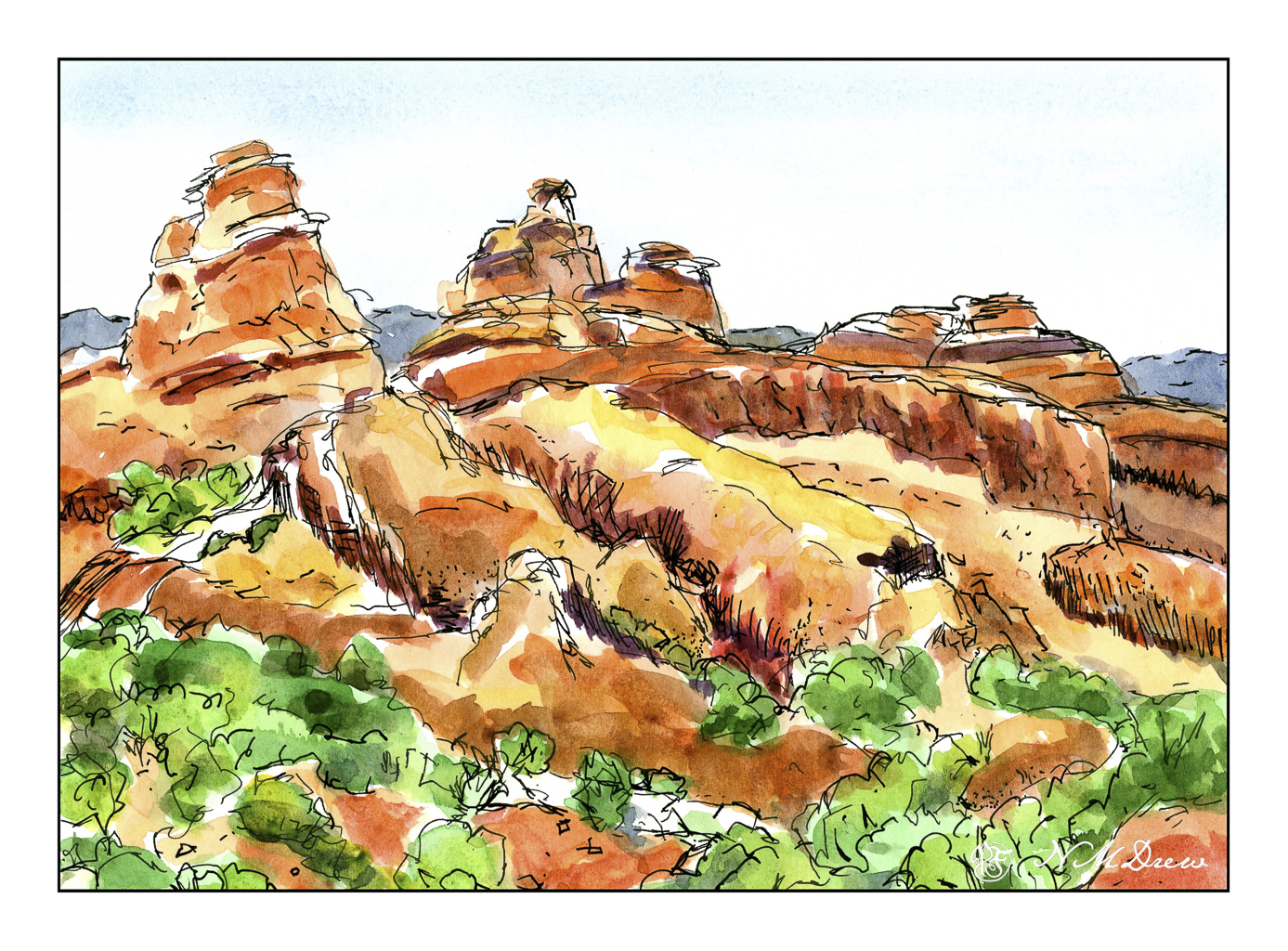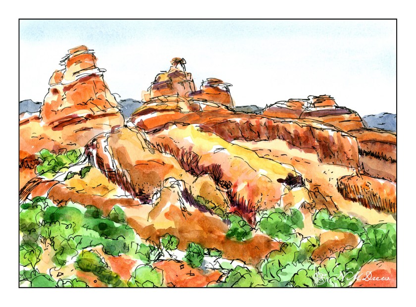 The American Southwest is amazing. Austere, rugged, rich colors of red barren stone showing sedimentary rock layers in many different colors. Plant life is tough and diverse and needs to be able to withstand extreme heat and cold, as well as arid conditions. Portraying these colors is really a challenge and a lot of fun as well! Here is the Devil’s Garden Trail area in Arches National Park. I thought doing it in pen and color might be the easiest route . . .