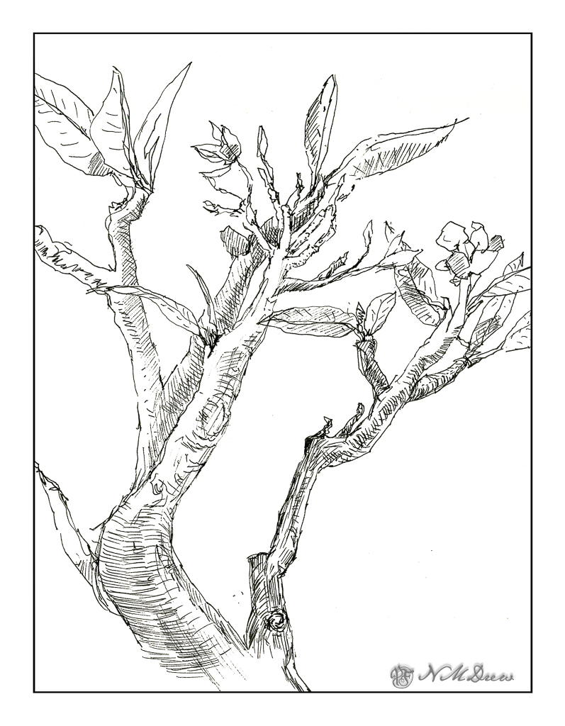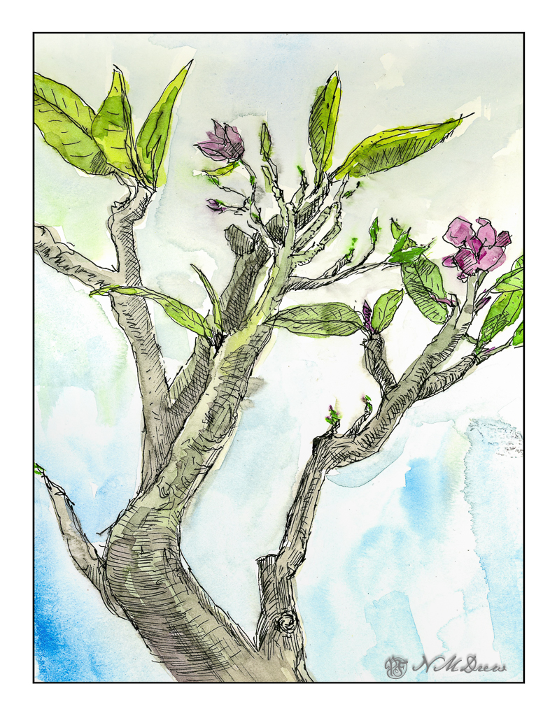 And so, what to do whilst I wait? One thing is always to go outdoors and sketch. My plumeria plant has been beckoning me for some time, as a sketch and as a painting. Today, ink and watercolor wash on some Vision watercolor paper.