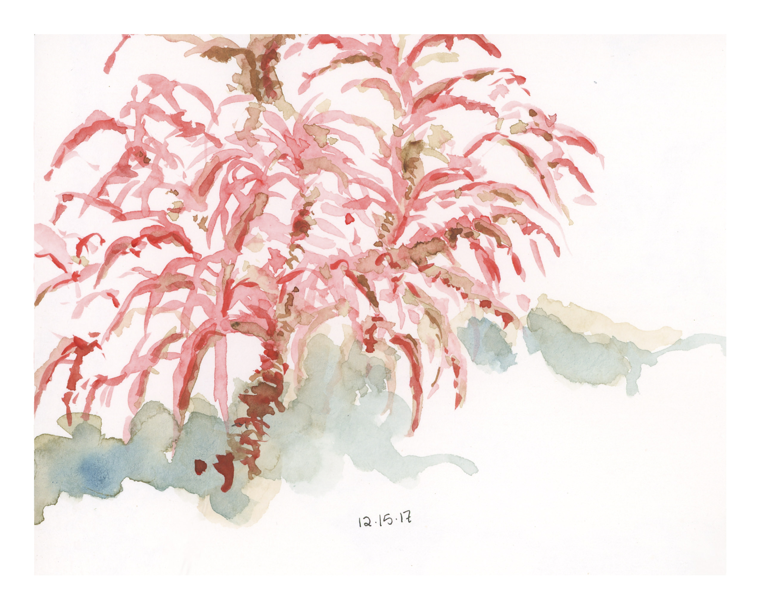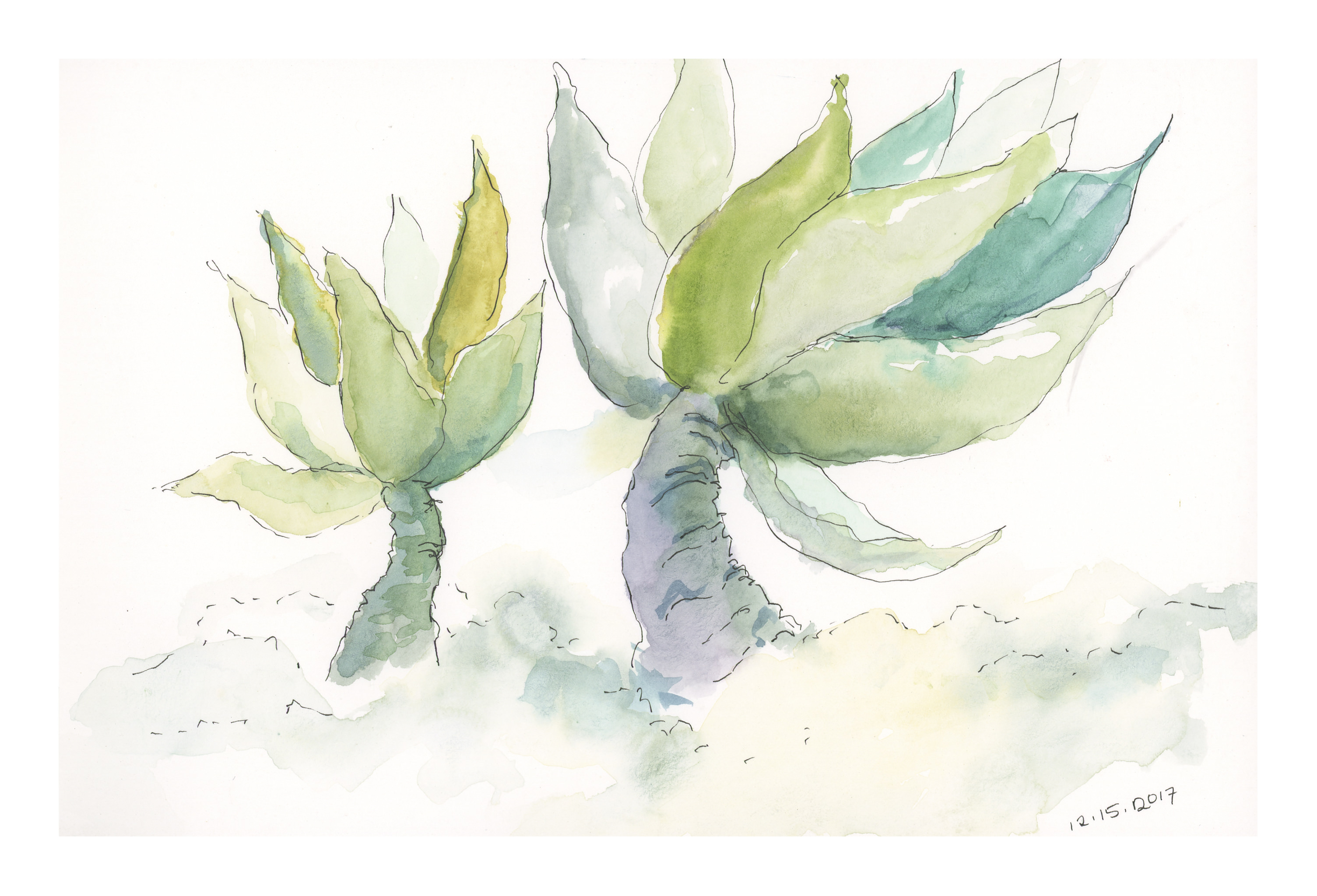 Next came this little weird succulent. It was on the gallery overlooking the marina, so I sat down and sketched it directly in ink. Plants don’t open you up to complaints about proportion (too often, anyway!), so off I went. I also wanted to see how the paper in this sketchbook would hold up to watercolor and I didn’t want to risk my boat to a poor water-paper combination. Luckily, it worked out quite well. I spent about 45 minutes on this drawing because I had to think about my colors and how thin I wanted the washes to be. In truth, this succulent was basically a silvery grey with a touch of subtle rust and green, but I needed to brighten it up.