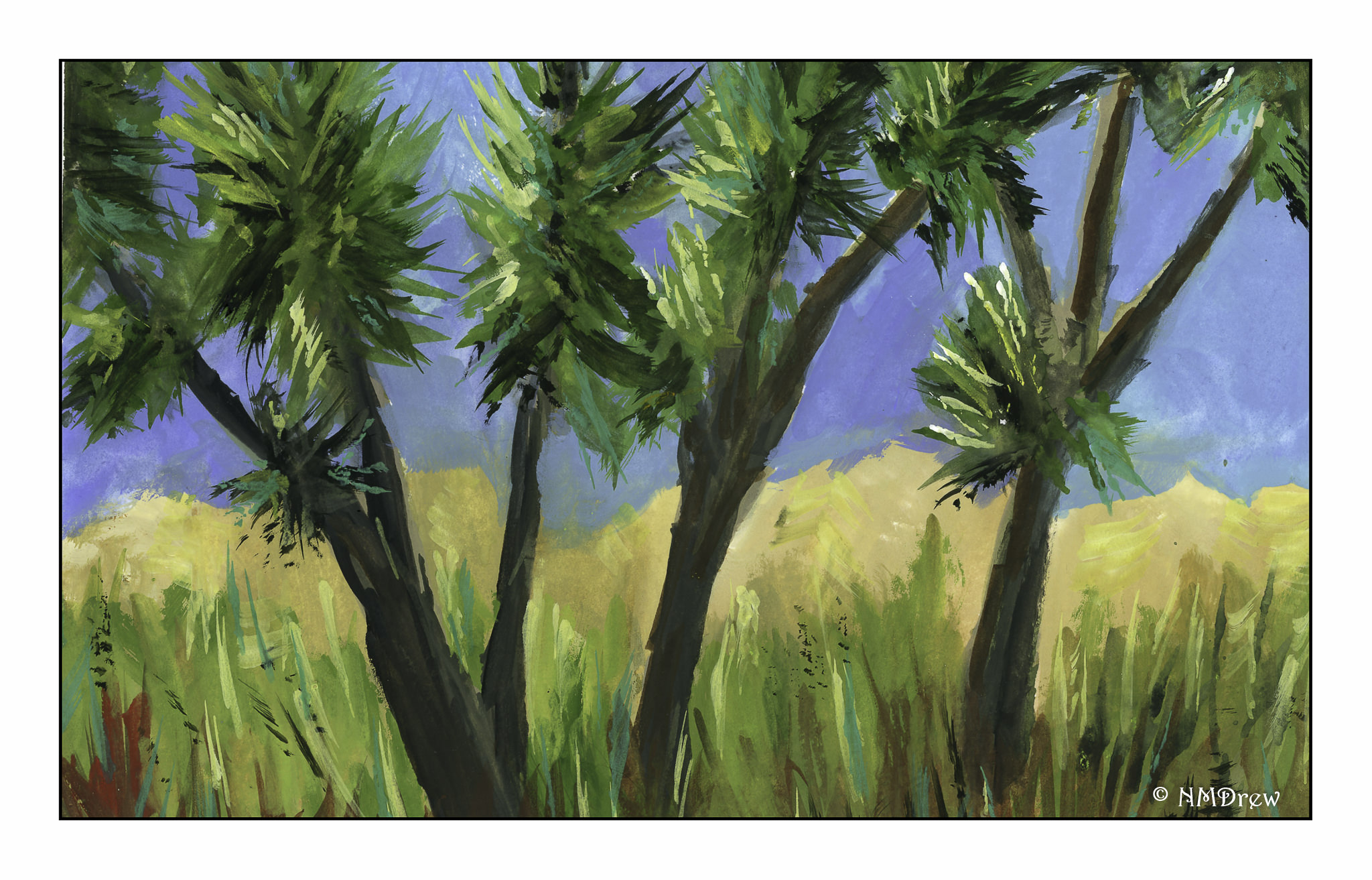 I started out with big color fields for the sky, trees, and sunflower field using the basic colors of blue (sky), dark green (trees), and yellow and green (sunflower field). From there, I really worked to keep the foreground simple enough as the treeline, mountains, and sky do not beg for detail.