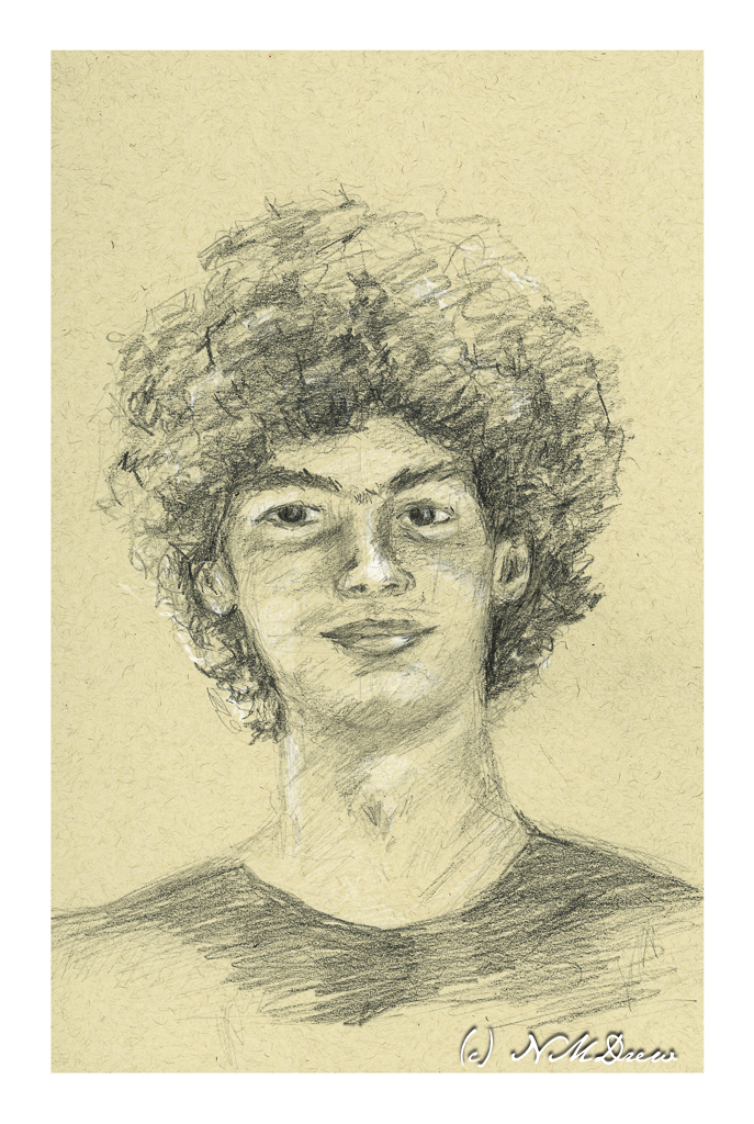We did a graduation party for Dakota, new high school graduate and soon to be university student. I decided the photo Auntie Am took was perfect for subject matter in yesterday’s class. Tan paper, hard and soft pencil, white Prismacolor pencil for highlights.