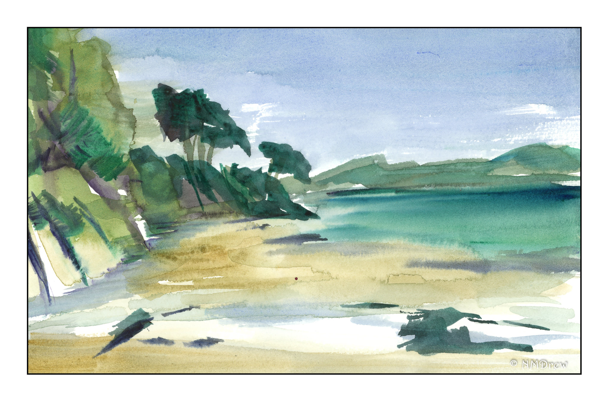 The last version of “The Slough, II” – at least for now! This is in watercolor, and it was actually fairly easy to render as I have now painted the same image 3 times, 6 if you consider the first series. Perspective is okay, but rendering of distance along the beach across the water is a bit problematic. Rather than using a pencil to create the drawing, I used a dagger brush and Quinacridone Gold to outline the shapes. I left the cliffs totally white and then added crevasses and such with varying colors.