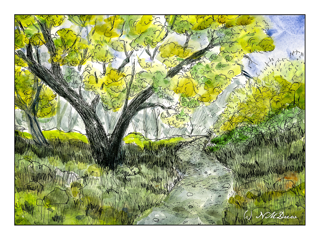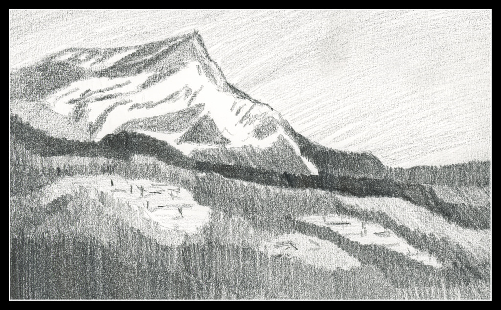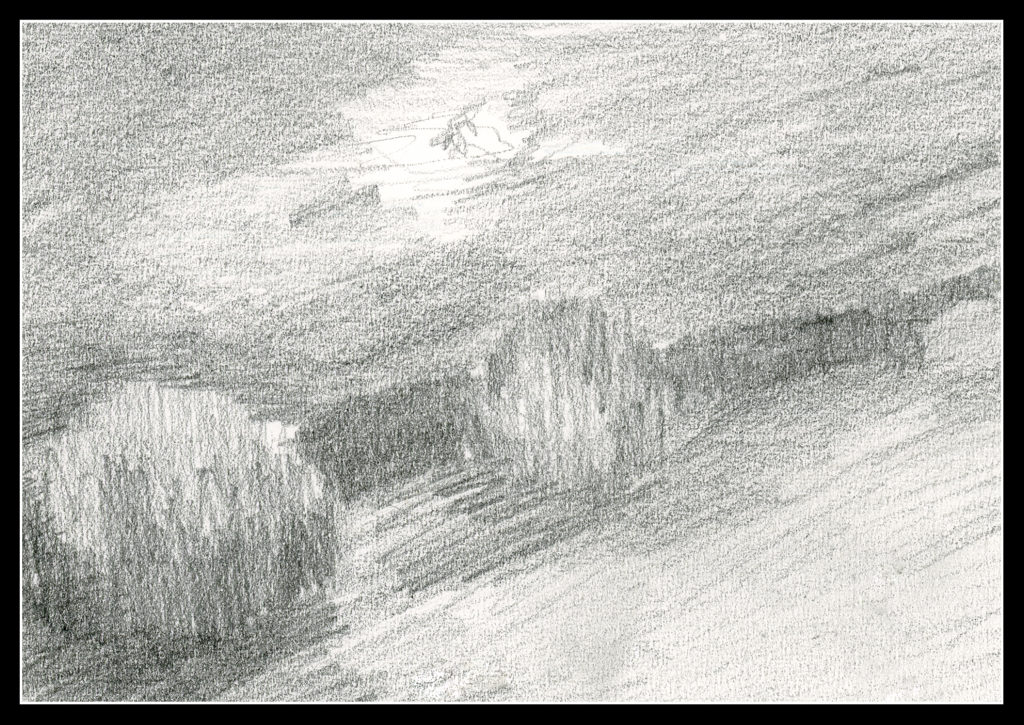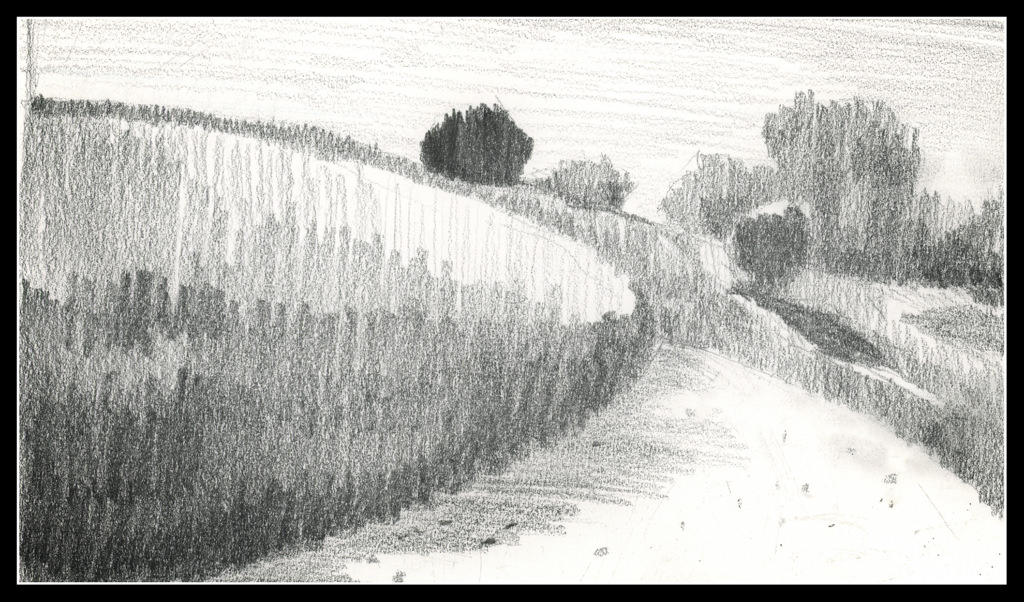 I am not quite sure if I like the values as I have them set up here – nor am I really sure about the focal point of the drawing. It seems the dark tree at the top is too dark, but it could be a leading line down the hill to the tree with the cast shadow. The trail leads the eye. In a painting, this could work out with warm and cool tones in addition to values. Maybe I’ll give it a shot!