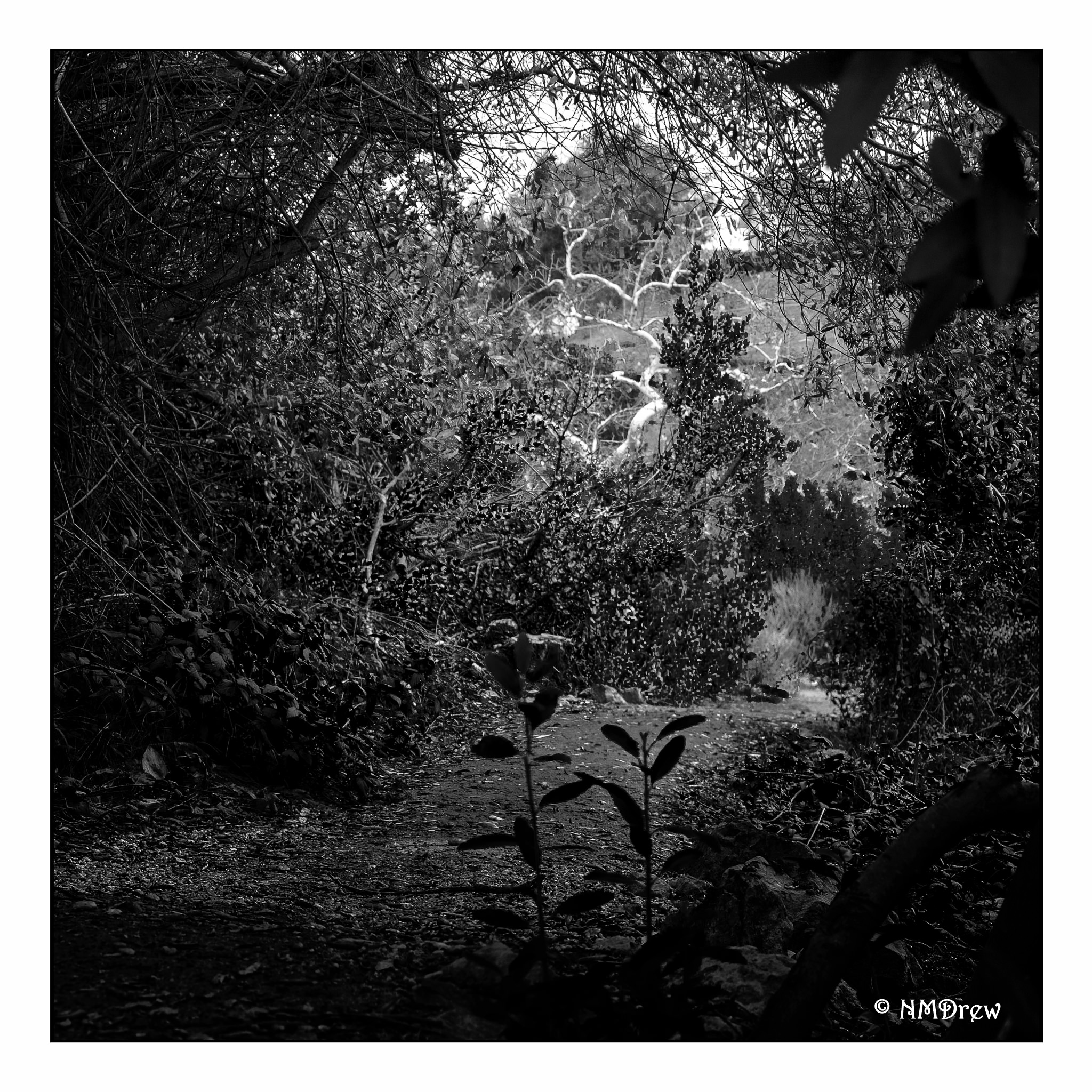 This is a view upward to the hill at the center of the local botanical garden. The white swath in the right foreground is the sand trail which winds around downward (behind the viewer) into the riparian woodland below.