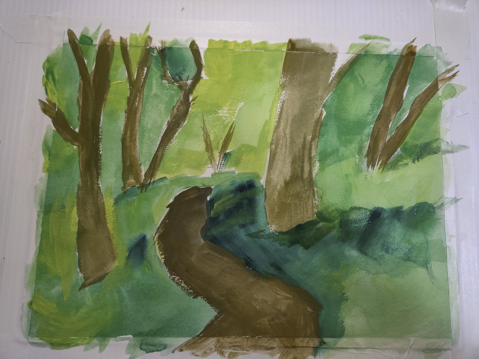 This is an underpainting for the gouache painting I did today. Wildflowers under the oak trees along a local trial – lupines, wild cucumber, white and yellow flowers of known and unknown species. Here, a la James Gurney, I decided to do an underpainting using casein paints. He suggests casein as the underpainting as it cannot be picked up, as can an underpainting of gouache, once it dries. It primes the paper, too. While the smell is rather gross, the substrate it creates is stable and I rather liked using it, not just for what it did for the paper, but to lay in some values as well.