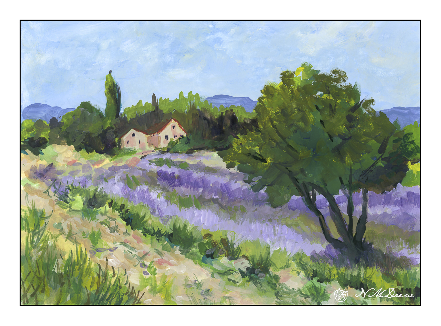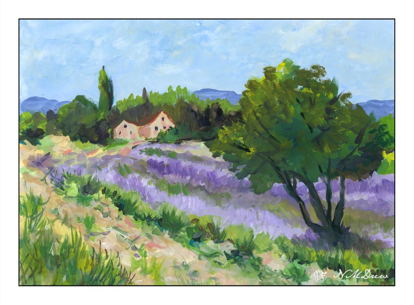 Back to lavender fields! The ones I have been doing in acrylic are a bit gaudy, but so is lavender. Some lavender is light, some is so dark it rivals the deep blues of lobelia. I tried to strike a bit of a more subdued approach to a large amount of lavender, and I think it works pretty well.