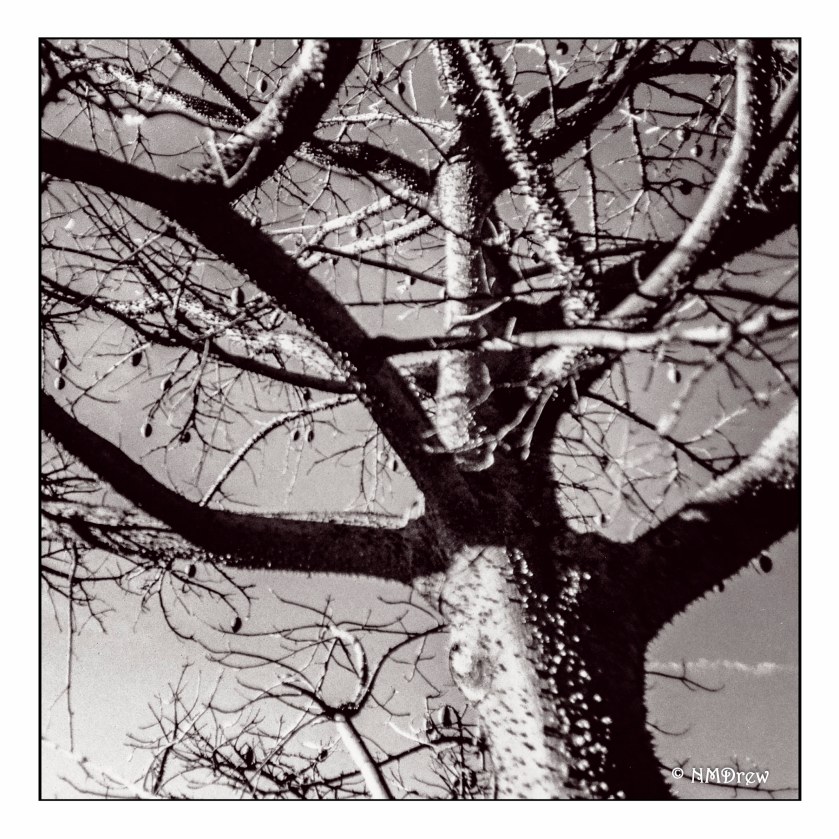 This is a tree in the local botanical garden. There are two of them. I keep forgetting what they are called. In the fall, they drop their leaves, and all their spiky bark shows much more clearly. In the spring, leaves of green and big, pink flowers.