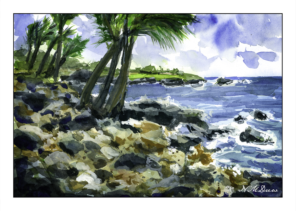 And then there are the rocks I have been thinking about since I did the much more successful cliffs of the other day. The rocks in the fort in the VI was okay as a rock building study, but not so hot as a painting. The beach scene below is of a rocky beach of lava stones – many black ones in particular, but with softer sandy rose colored stones in between. And a few palm trees. And an ocean. And a spit of land sticking out. The rocks were the primary focus as that is the rocky subject I am approaching. Simplification of shape and shadow – some successful, some not.