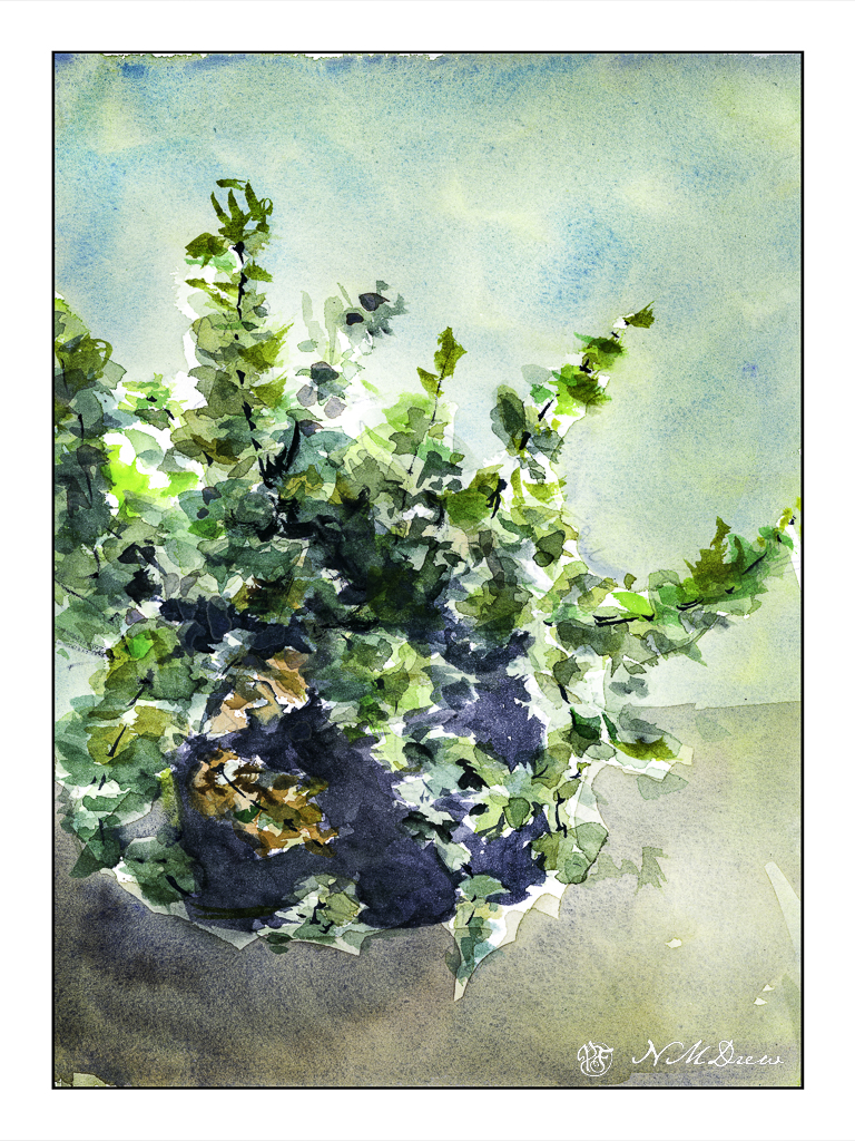 Let’s start with my painting of Greek oregano, growing like a weed in a pot on the patio. The leaves are simple enough, shaped somewhat like an egg (but flatter 🙂 ) on long, straggly stems. The color is sort of that dull, sagey-olive green that plants in the Mediterranean climate often have. In sunlight, a bit of warm yellow shows up. In shade, the greens are darker. Pretty logical, right?