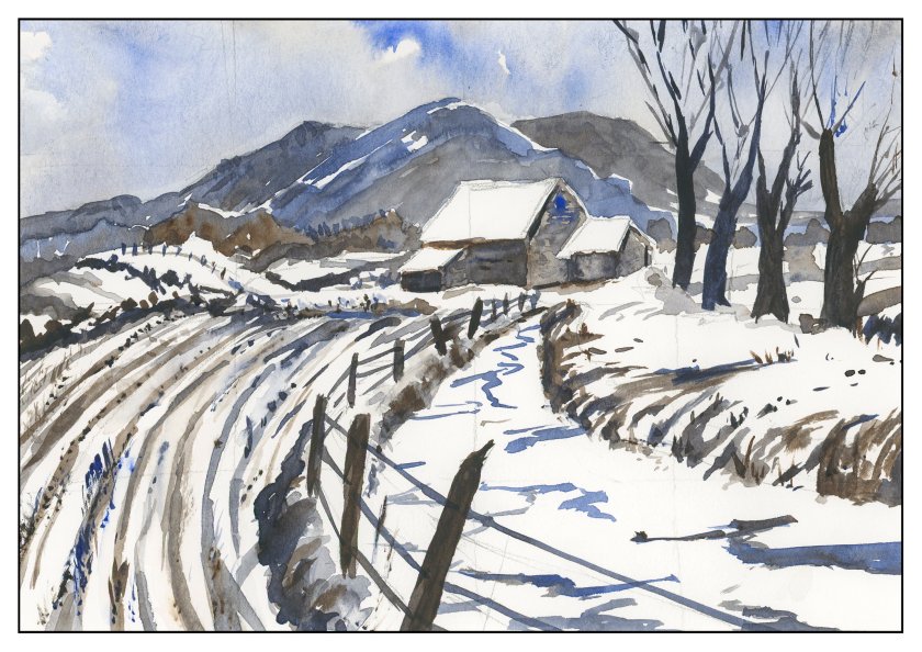 The shadows across the snow, and the ruts, were painted with plain ultramarine, as was the sky. It’s a great color for shadows, on snow or otherwise. You will see that the dark colors, such as on the trees to either side in the foreground, are blackish, but of a very different hue than the darks in the paintings above.