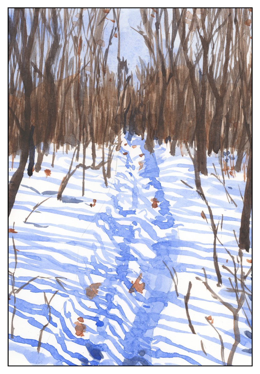 The umber and ultramarine are considered to be “warm” colors from what I have read, but they work to make wonderfully cold winter scenes! Here are some I did after the one above, to continue the study.
