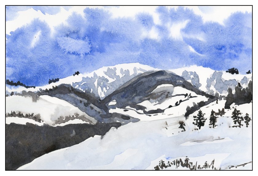 From there, another wet-in-wet, accompanied by a gradated wash, in the above painting. I started with pure Ultramarine Blue, and then worked it lighter and lighter until I reached the bottom of the sheet. Then, with a dry brush, I worked upward to remove the blues. You can see some blue streaks left behind. After the picture was finished, I used white gouache and a toothbrush to spatter snow onto the painting.