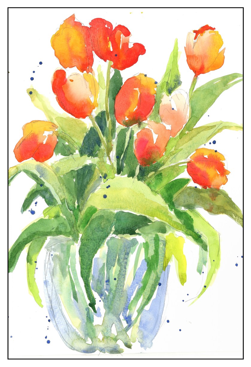 Having photography as a hobby sometimes yields pictures that can be used to create more pictures. I decided to give up the no-lines approach for now (though it is a great exercise to learn how to make shapes – I was just really frustrated by what I was doing), do some pencil roughing, and then work one color area at a time. First the tulips in shades of red, orange, and yellow, mixing some oranges as I went. Next, the greens of leaves and stems, consciously determining the areas to negative paint later on, as for the flower petals. Finally, the bowl. Before the whole was done, I went back to each area and tried to create a sense of depth by deepening other areas and being careful not to touch the areas I had left deliberately white.