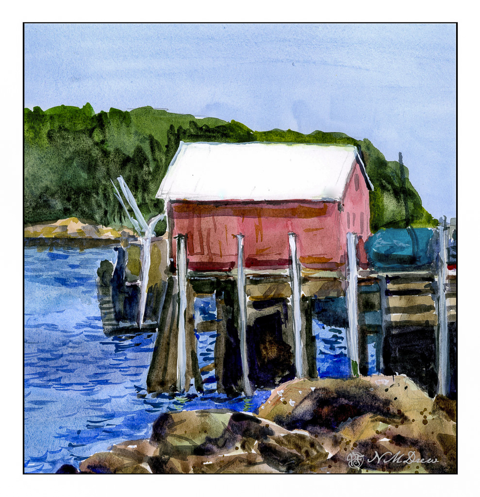 Next, the sky. It is a very flat sky so I did a wash of a blue mix once I had dampened the paper, carefully working around various shapes. From there, the red of the building on the pier, working around the light uprights. Then, the green of the trees in the distance, being careful about the roof. Finally, the water.