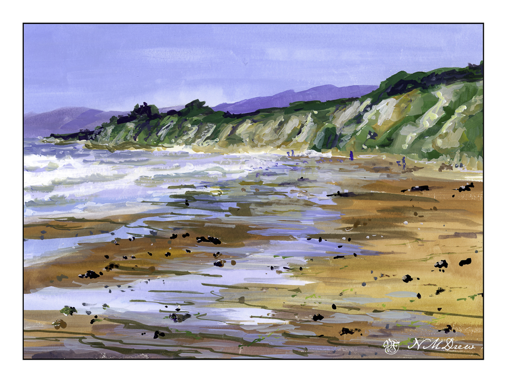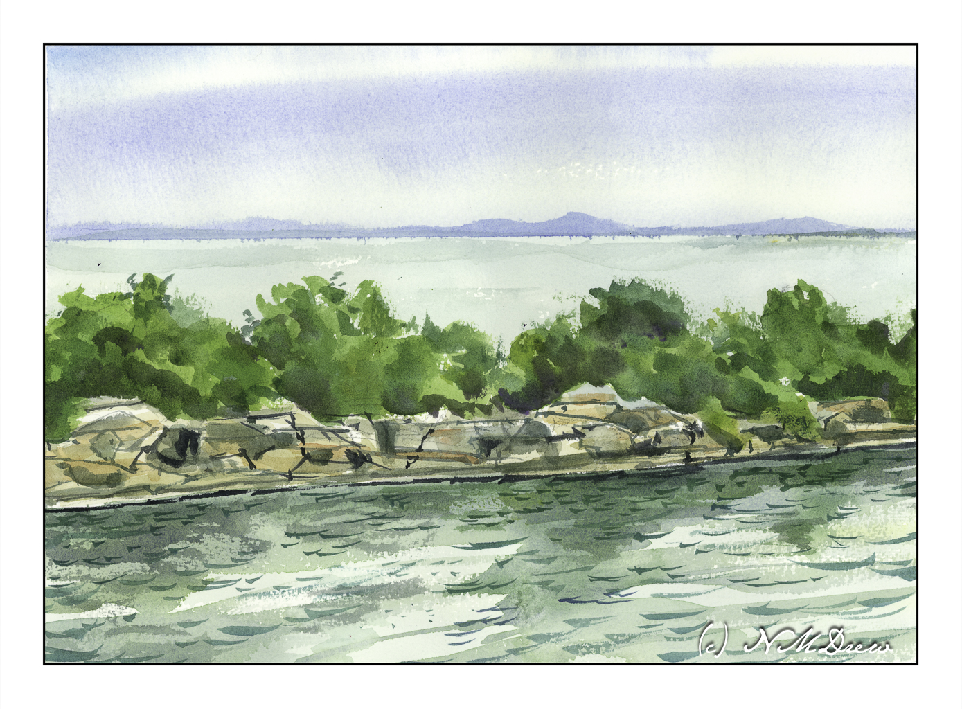 My focus here is the graphic quality of sky, land, sea, trees, stone, more water. The scene is quite simple but the detail can be a bit overwhelming – I want to be specific and show every leaf and grain of stone and wave in the water. I needed to make it very simple for it to work, keeping the sky and distant land and sea simple before moving to the middle ground trees.