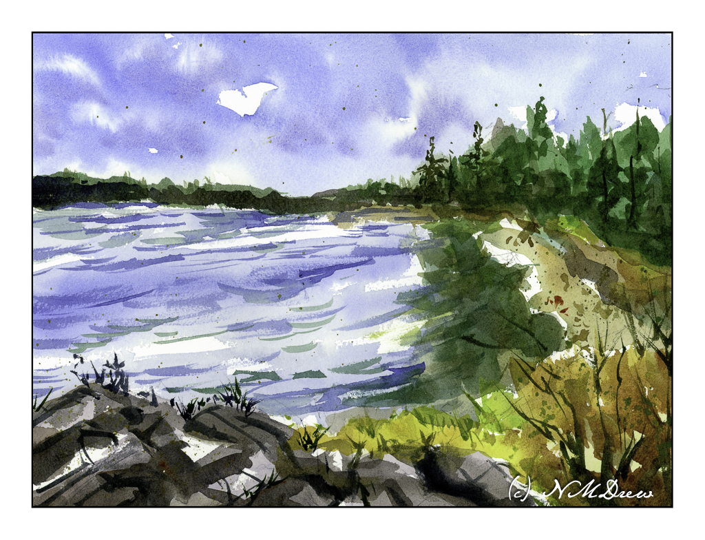 And, I think it does. I like the way my trees tuned out – masses of greens in different value to add depth and suggest the denseness of its growth. The rocks of the quarry walls are filled with straight lines which can be vertical, horizontal, or diagonal. The color of the stone is a rather warm white to ochre, but light, too, renders it warmer or cooler. Finally, the water itself in the foreground. A calm water, but a bit of wind. Reflections in the water and ripples on the surface. More detail, but hopefully not too much.