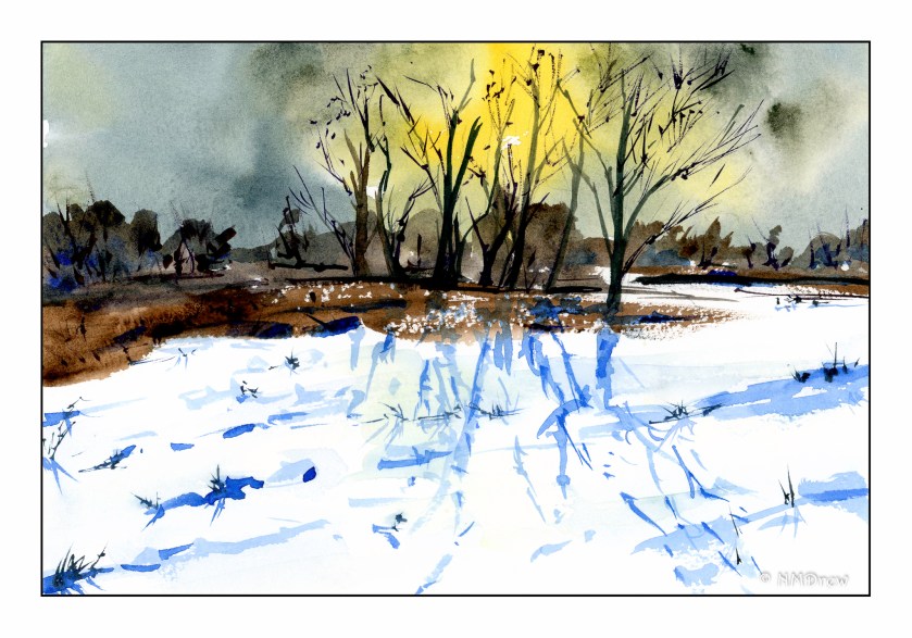 Here, a winter landscape, partly from memories of those lovely, cold afternoons in upstate New York or rural Illinois, when the clouds were low and dark, snow was on the ground, but somehow, the sun made it through, casting shadows and a bit of color on the vast swaths of white.