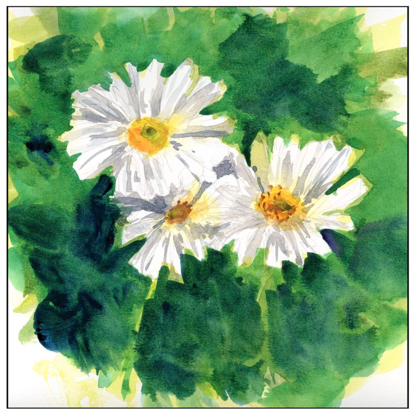 Below is one of my first focused attempts on negative painting. Supposedly these are chamomile flowers, but the fact is they look a lot like any generic daisy. Painted on the cellulose paper, absorbency was an issue, as seen clearly on the flowers. Blending of color was rather forced. However, I could paint around the white of the flower and get crisp edges. The outside green was more difficult; I think if I used water between two green values to soften the edges, blending might have been more successeful.