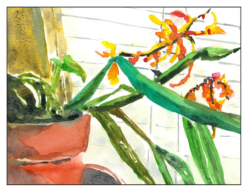 Orchid in the Window This morning I found a photo I took a couple of years ago of an orchid in a southwestern facing window. I focused on the orchid; this blew out the details behind. I rather liked the effect. This is my morning painting.