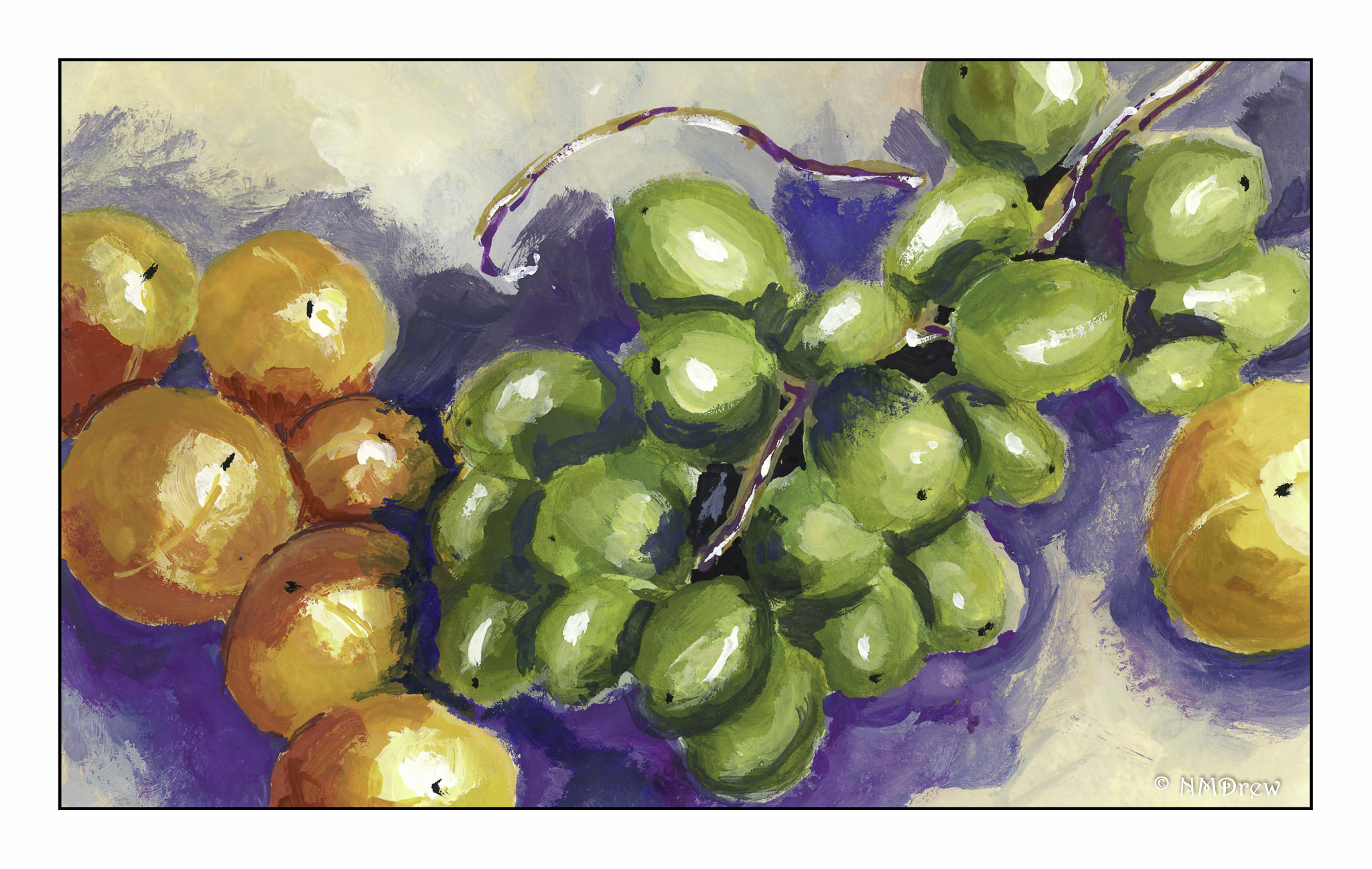 Both of these are in gouache. I painted the figs first and then the grapes and apricots. I worked hard on trying to create a sense of depth with the second painting in particular – looking for light and dark, shadow and colors.