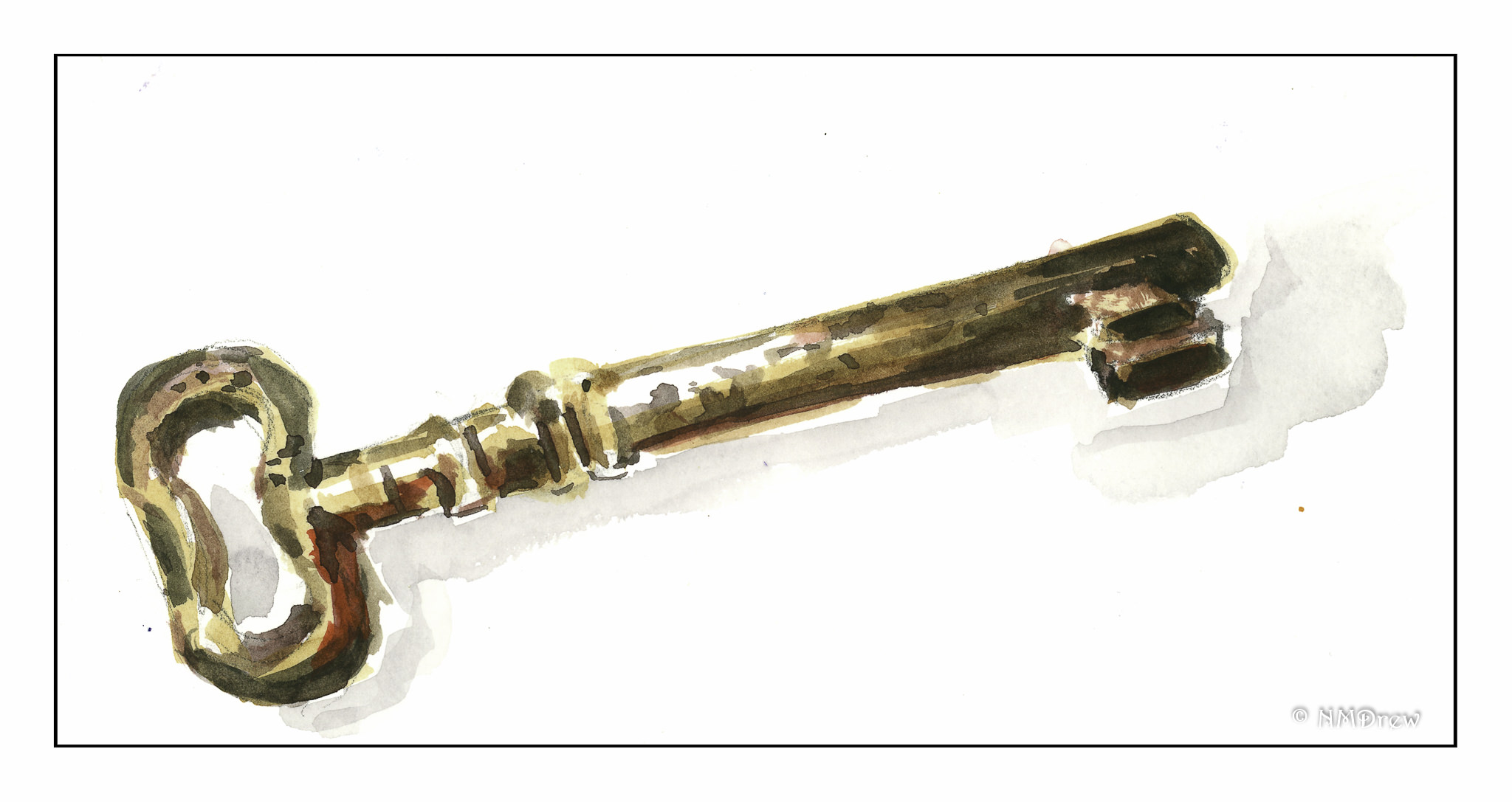 Metallic items, reflective surfaces – in others words, shiny things – can be very challenging to paint. In many ways, the mind rebels. It’s shiny! I can’t paint that! But, in reality, metallic and shiny objects are simply shades of colors, sometimes similar, sometimes varied. Once you think about it like that, it becomes much easier. I chose an old enameled metal kettle, a spoon, and a key. Each one has different colors, with the spoon simply being varying shades of the same color, Payne’s Grey. The kettle was difficult because of its shape (it’s rather mangled) and the key because of the varying shades of brown, golds, reds, and oranges of the brass.