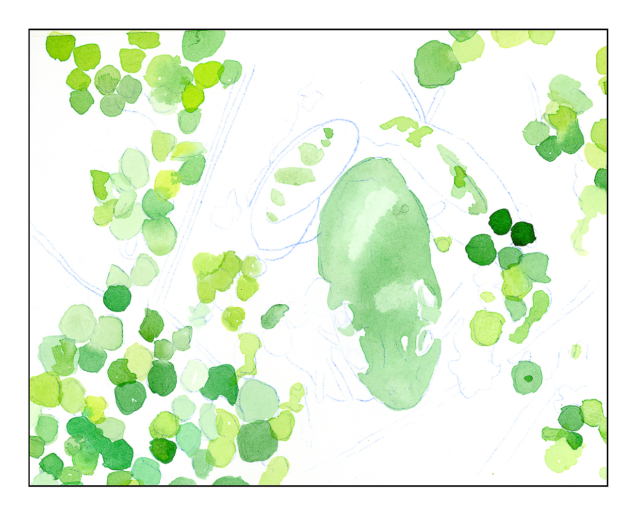 Previous Image Next Image Greens of frog and pond vegetation. The first step of the painting / drawing is to put in greens.